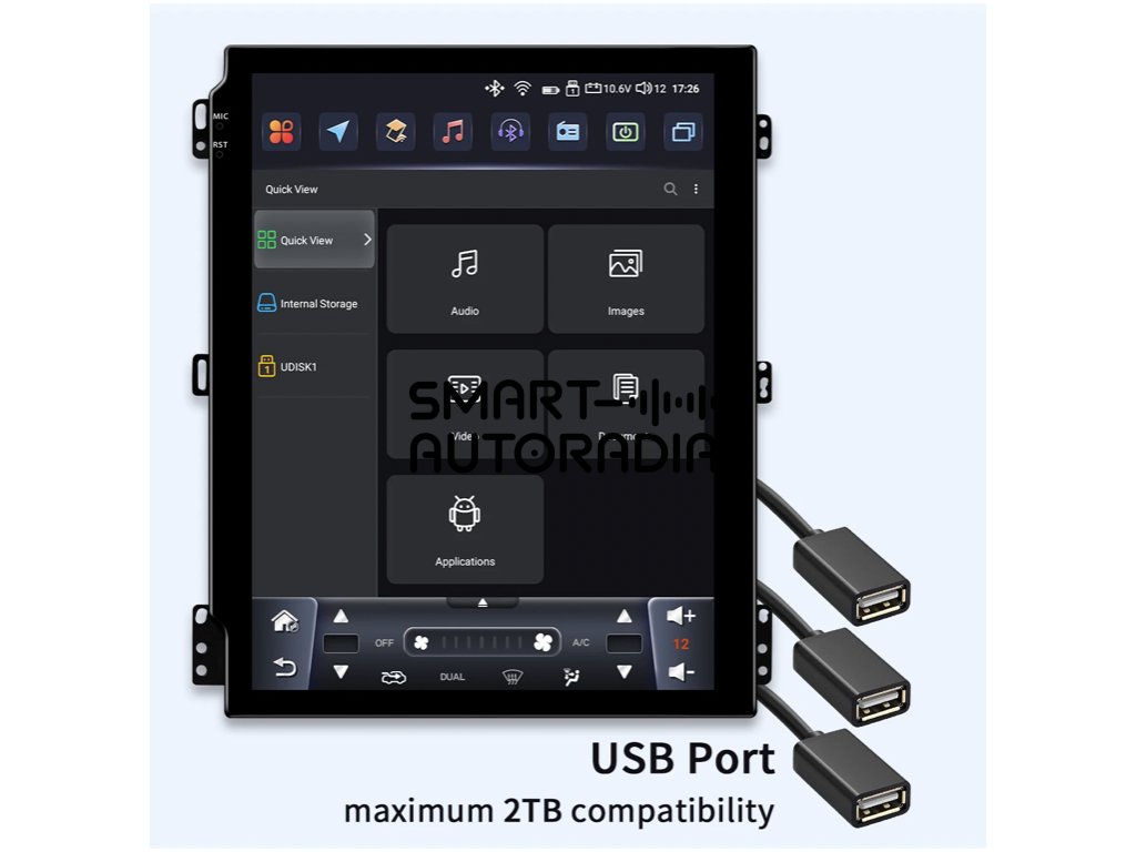 Zariadenie má celkom tri vstupy USB prostredníctvom káblov zo zadnej strany autorádia. Vstupy potom môžete smerovať na vami preferované miesto, napríklad do priestoru pre cestujúcich. Podpora externého úložiska s kapacitou až 2 TB.
